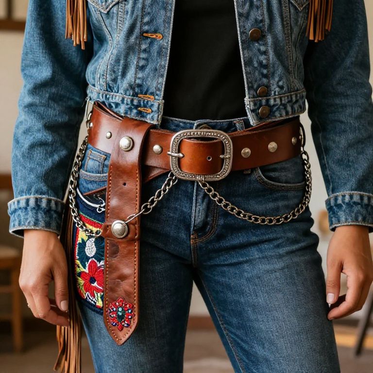 Close-up of avant-garde vaquera accessories: oversized leather belts, layered chains, embroidered patches, and fringe details on denim jackets, richly textured and illuminated in soft natural light against a blurred rustic background, showcasing craftsmanship and bold design.