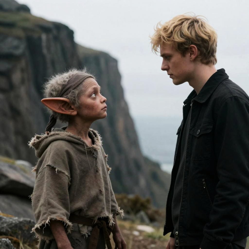 Photograph of a young man with blonde hair in a black jacket facing a small, humanoid creature with large ears, tattered clothes, and a headband. Background shows rocky cliffs and cloudy sky. Man looks serious, creature looks up with open hand. Two people.