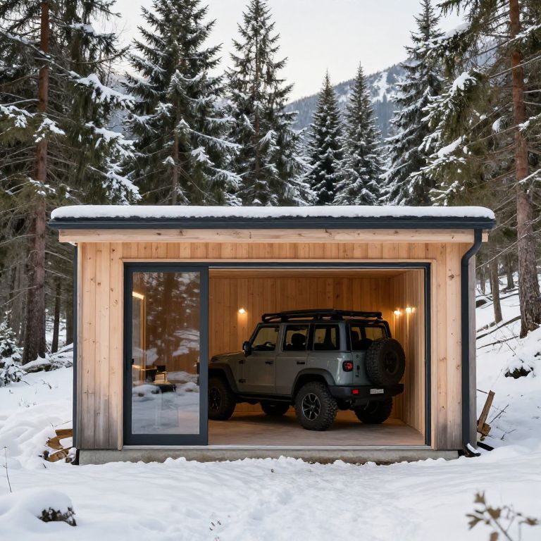 Minimalist cochera in a mountain cabin, exposed wooden walls and large glass doors, rugged off-road vehicle parked inside, snow-covered pine trees outside, soft natural daylight streaming in, serene and inviting atmosphere with nature blends