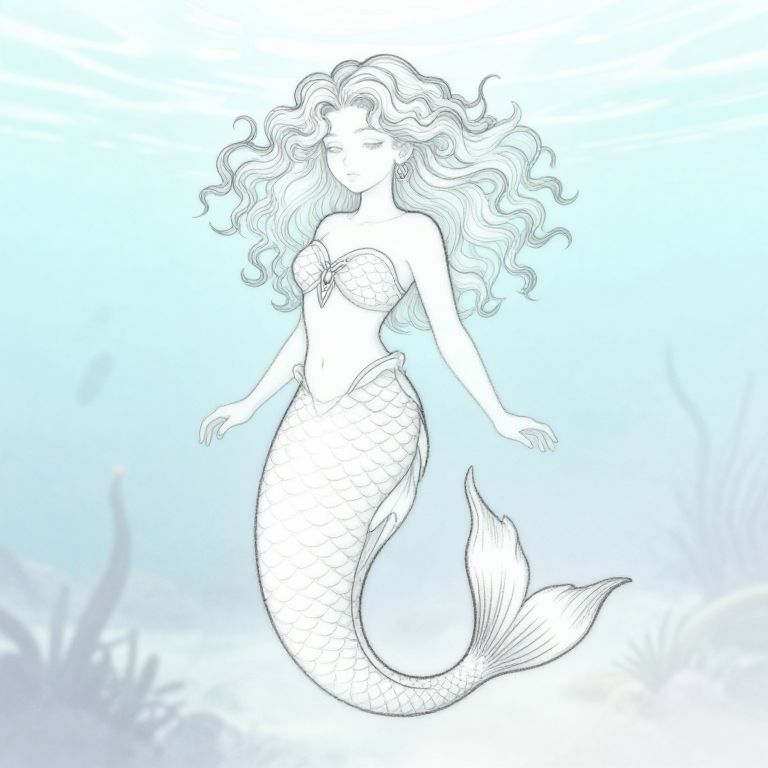 Mermaid drawing outline embracing fantasy art style, detailed figure with curly hair and fish tail, outlined in smooth strokes, with faint underwater plants and soft waves in background, ideal for tattoo inspiration.