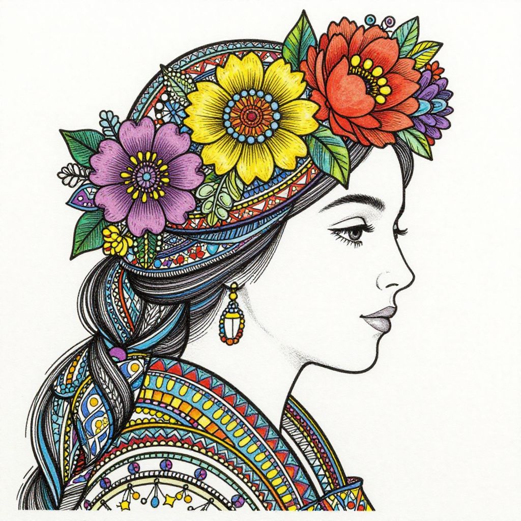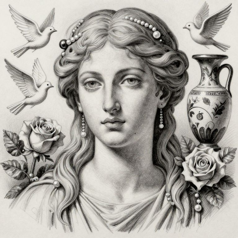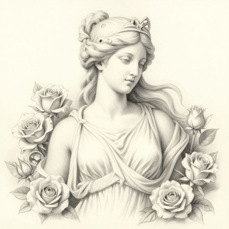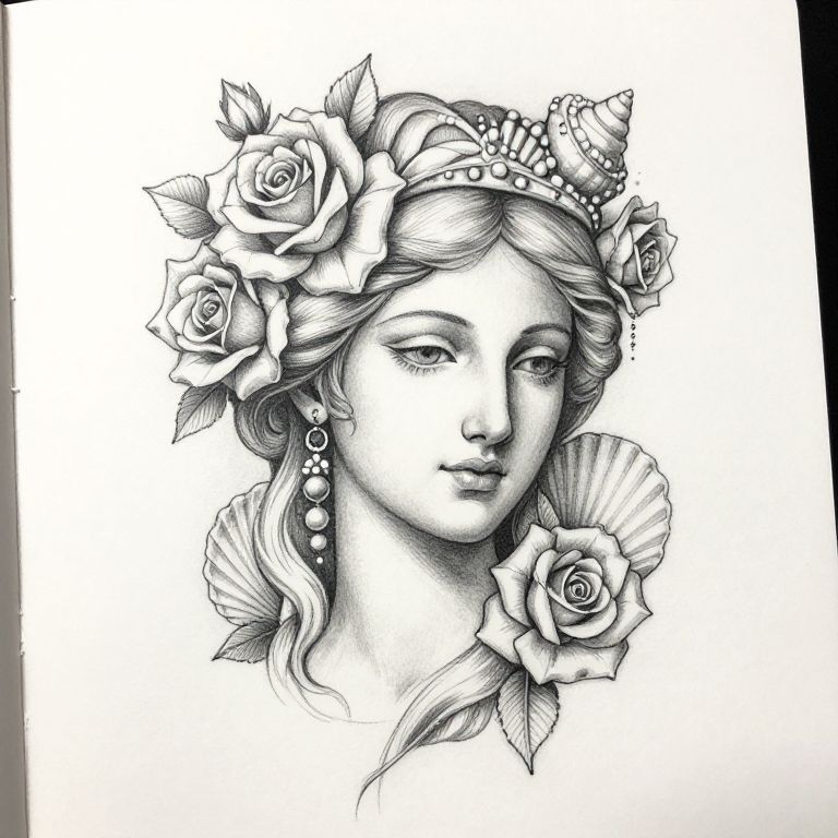 Goddess Aphrodite tattoo sketch showcasing a serene face adorned with blooming roses and seashell motifs, rendered in fine, detailed lines with subtle shading to highlight the divine beauty and grace of the ancient Greek goddess.