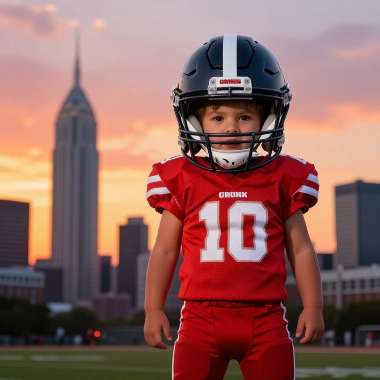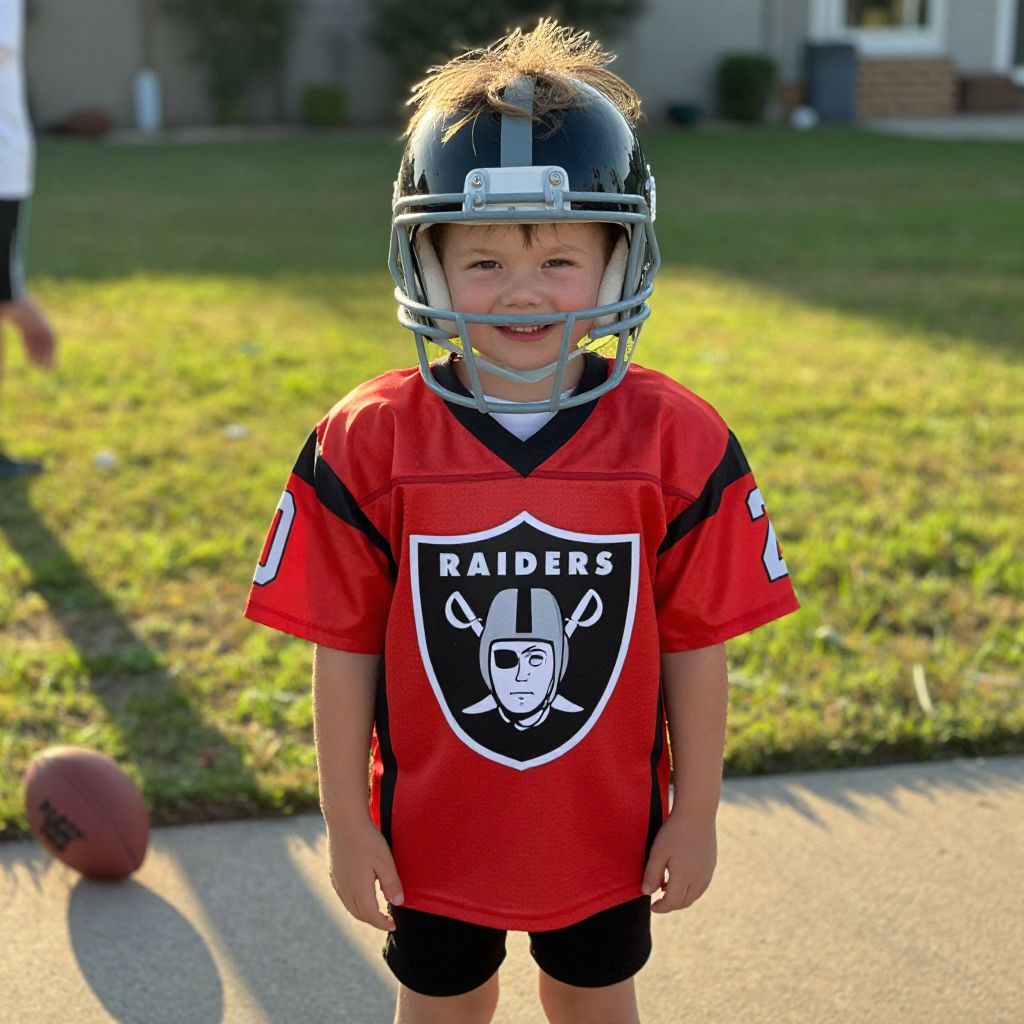 A candid shot of a child in a kid NFL Raiders uniform costume, a small boy with round face, messy brown hair, and a friendly smile, wearing the official red and black uniform with a helmet on, standing near a football field during a backyard game, golden hour sunlight casting long shadows
