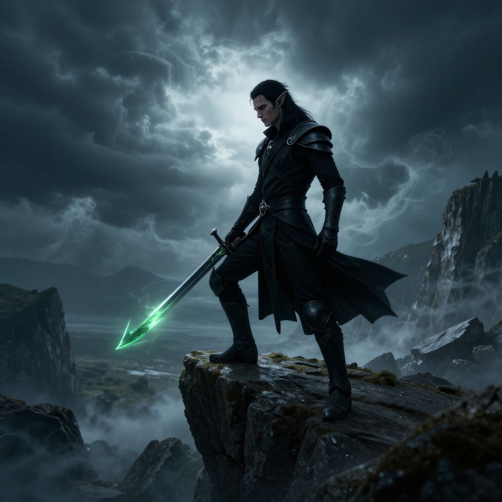Dark elf man poised on the edge of a cliff overlooking a vast, stormy landscape, his lithe form wrapped in sleek midnight armor, wielding a curved obsidian blade that reflects eerie green light, surrounded by swirling magical mist and jagged rocks.