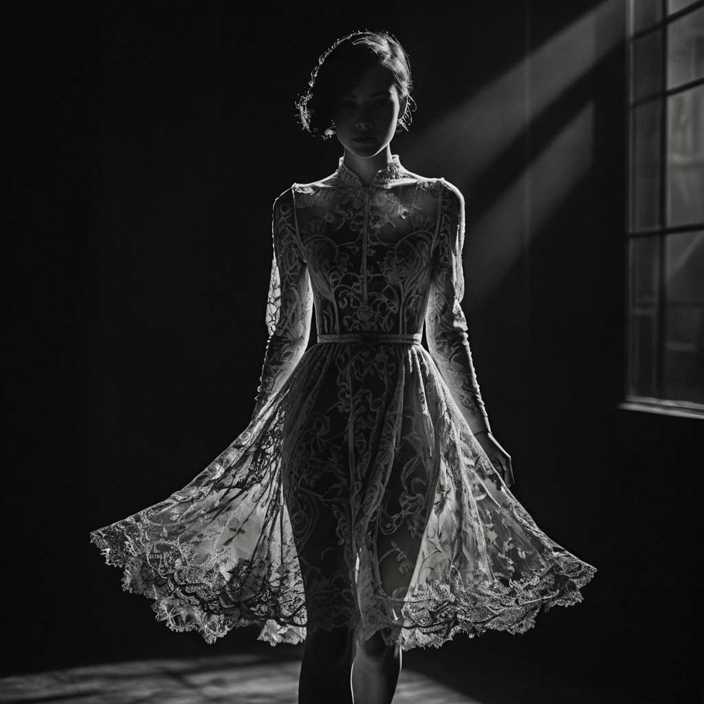 Photo of a Long Torso woman, High Fade, silk slip dress with a thigh-high slit and lace trim, high-gloss fashion photography.