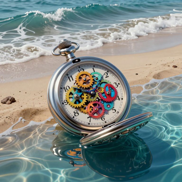 Photograph of a colorful, gear-styled pocket watch with open lid, resting on a sandy beach with gentle waves.