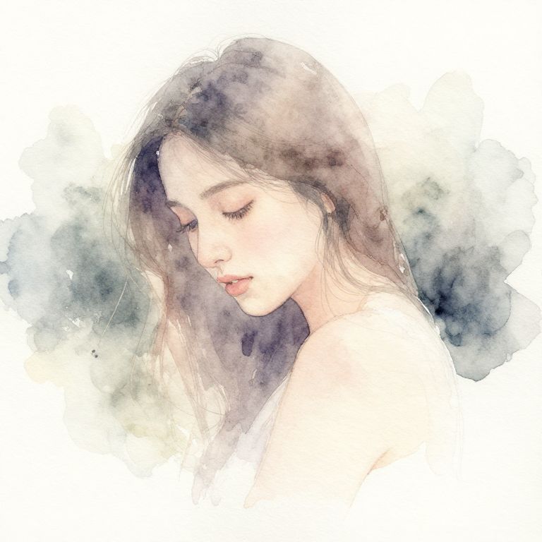 A digital watercolor-style illustration of a young woman with long, flowing, galaxy-patterned hair, blending blues, purples, and whites. She has fair skin, closed eyes, and delicate, pink lips. Her right hand gently touches her forehead, with a slight tear visible on her cheek. She wears a simple, white tank top. The background is solid black with white, rain-like streaks, adding a melancholic, rainy-night atmosphere. Her serene expression contrasts with the dark, textured background, creating a poignant, emotional scene.