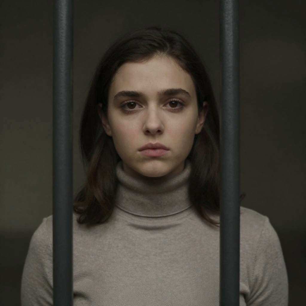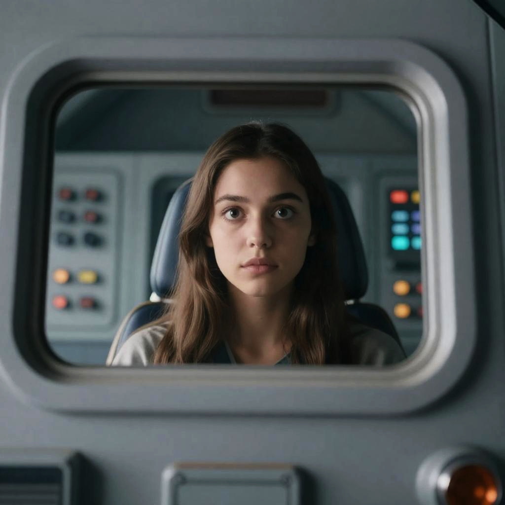 Photograph of a young woman with long brown hair, wide-eyed expression, looking through a window into a futuristic cockpit. Background shows control panels with buttons and dials. She is centered, looking directly at the viewer. Gray, metallic cockpit interior.