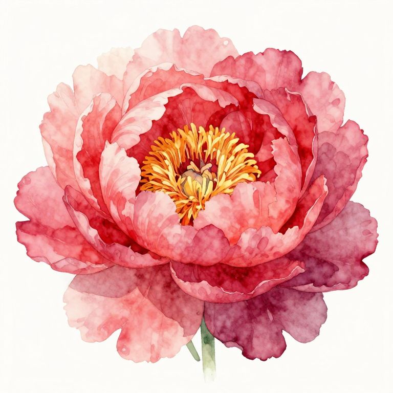 Watercolor painting of a vibrant pink peony with red and yellow center, detailed petals, and soft gradients, against a white background.