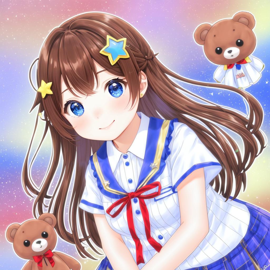 Digital anime-style illustration of a virtual YouTuber girl with long brown hair, blue eyes, and star-shaped hair clips. She wears a white and blue sailor-style school uniform with a red ribbon and pleated skirt. Two teddy bears with bow ties and capes appear floating near her against a colorful starry background.