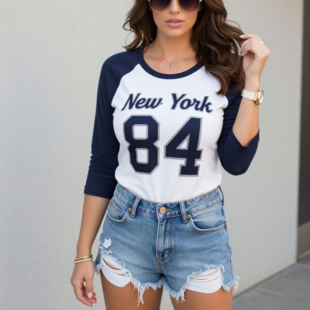 "Woman, casual, sports-inspired raglan top in white and navy, "New York 84" graphic print on chest, round neckline, three-quarter sleeves, distressed denim shorts, frayed hem, mid-rise, five-pocket design, gold-tone wristwatch, layered bracelets, aviator sunglasses.. Sexy. Pretty face and beаutiful eyes. Big breasts."