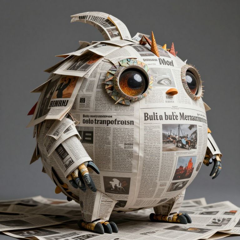 An intricate creature made from newspaper, round body, a sense of depth and mysticism, enhanced background, creative, vibrant, amazing details, amazing artist, sharp edges, full view, atmospheric lighting, amazing visuals