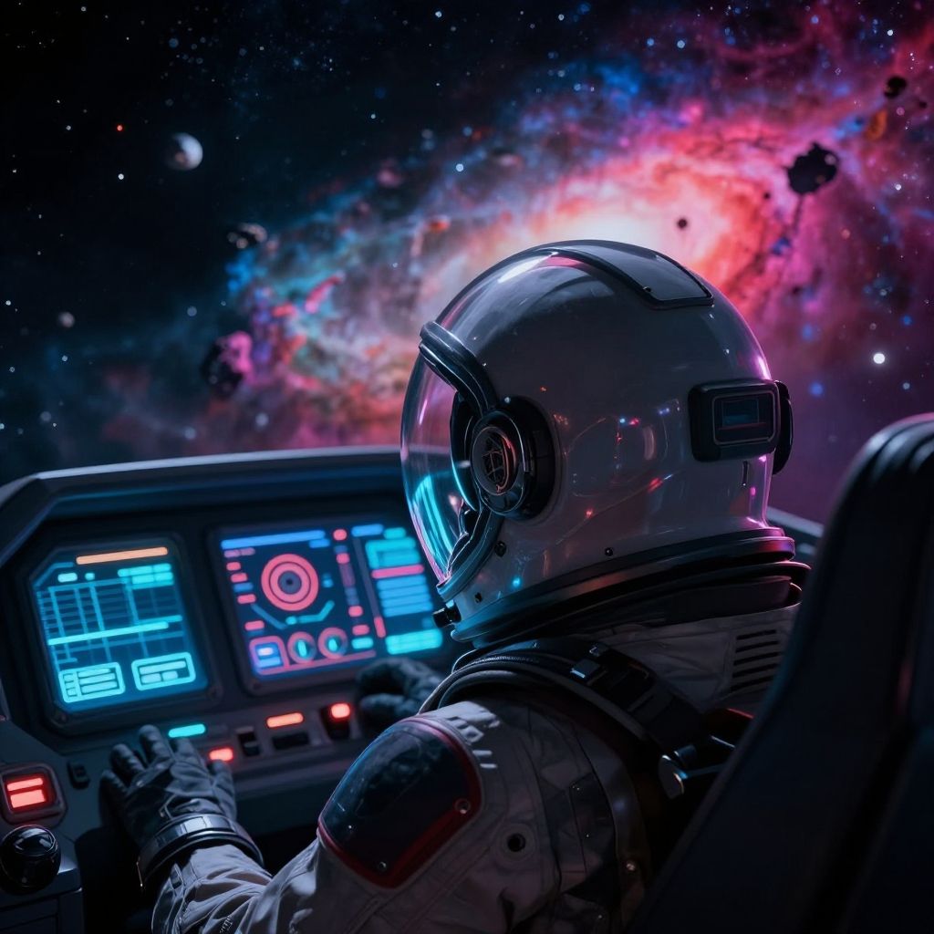 Digital art of an astronaut in a shiny helmet, surrounded by colorful, star-filled space, with control panels glowing blue and red.