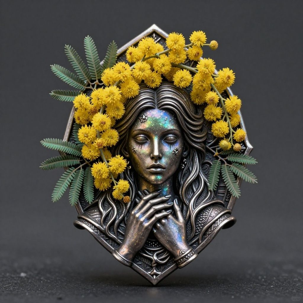 Metal trinket depicting a Mimosa (flower)Regina Valluzzi, natural, shimmering, vibrant, gothic, rpg, 1400ad, ultra detailed, detailed, immersive, reminiscent of high fantasy RPG games, HD, masterpiece, best quality, hyper detailed, super realistic, perfect face, perfect hands, award-winning, professional, breathtaking, linquiverafanciful Oasisdreadful weatherpixel-art . low-res, blocky, pixel art style