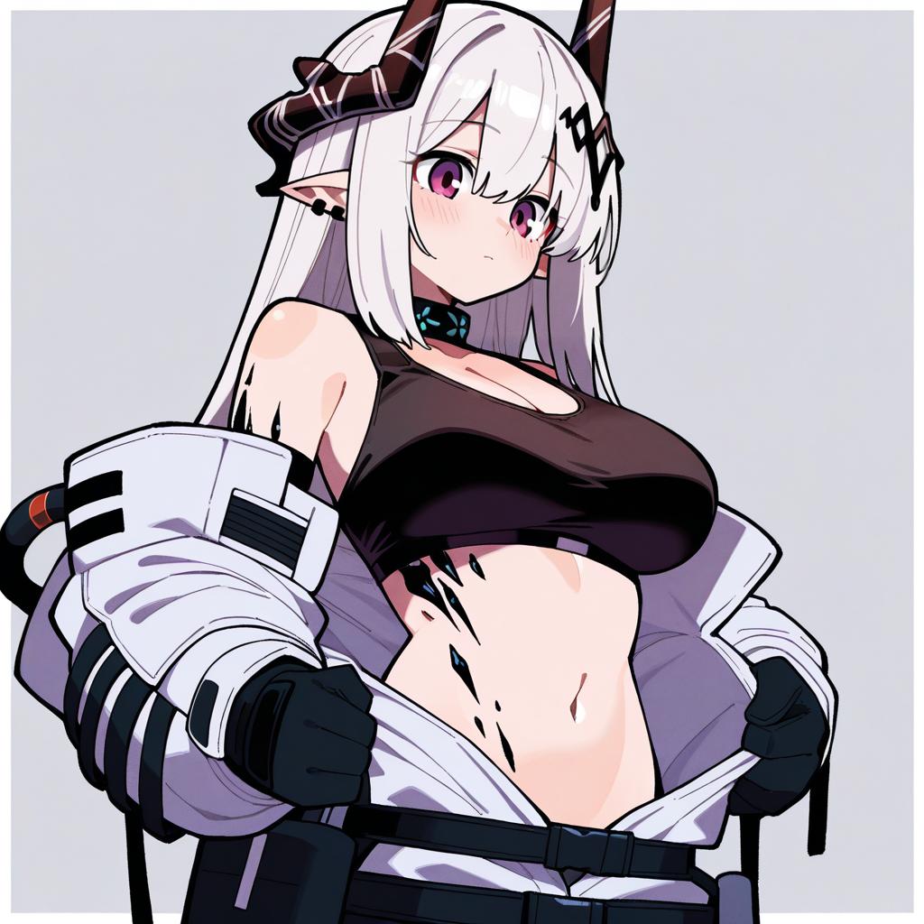 Mudrock (elite ii) (arknights), arknights, 1girl, pointy ears, horns, ear piercing, red eyes, hair between eyes, long hair, white hair, grey hair, hair ornament, large breasts, cleavage, navel, black sports bra, black gloves, bare shoulders, off shoulder, long sleeves, black choker, oripathy lesion (arknights), material growth, infection monitor (arknights), crop top, midriff, stomach, by artist nploser, illustrious