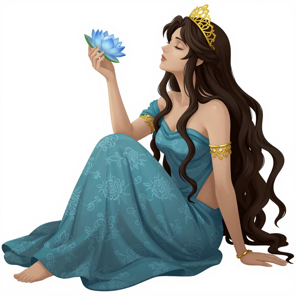 Digital illustration of a fair-skinned, dark-haired woman with long, wavy hair wearing a gold tiara and blue floral-patterned off-the-shoulder gown. She sits barefoot on the floor, smelling a glowing blue lotus flower held in her right hand. Her left arm rests on her knee, adorned with a gold armlet. Her eyes are closed, and she has a serene expression. The background is plain white, emphasizing her elegant and ethereal appearance. The artwork features smooth, vibrant colors and a semi-realistic style.