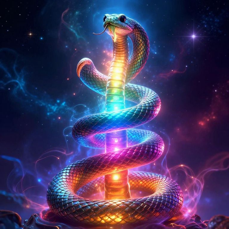 Kundalini serpent images, mystical coiled snake rising through vibrant chakras along the spine, glowing energy aura, psychedelic cosmic background, detailed scales reflecting light, spiritual awakening symbolism.