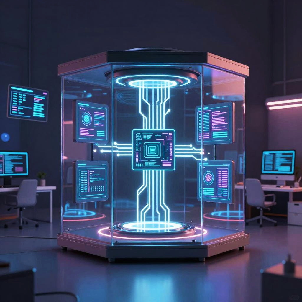Futuristic PC inside a minimalistic glass cube, glowing circuits and AI interface, surrounded by floating digital screens and vibrant neon accents, sci-fi workspace environment
