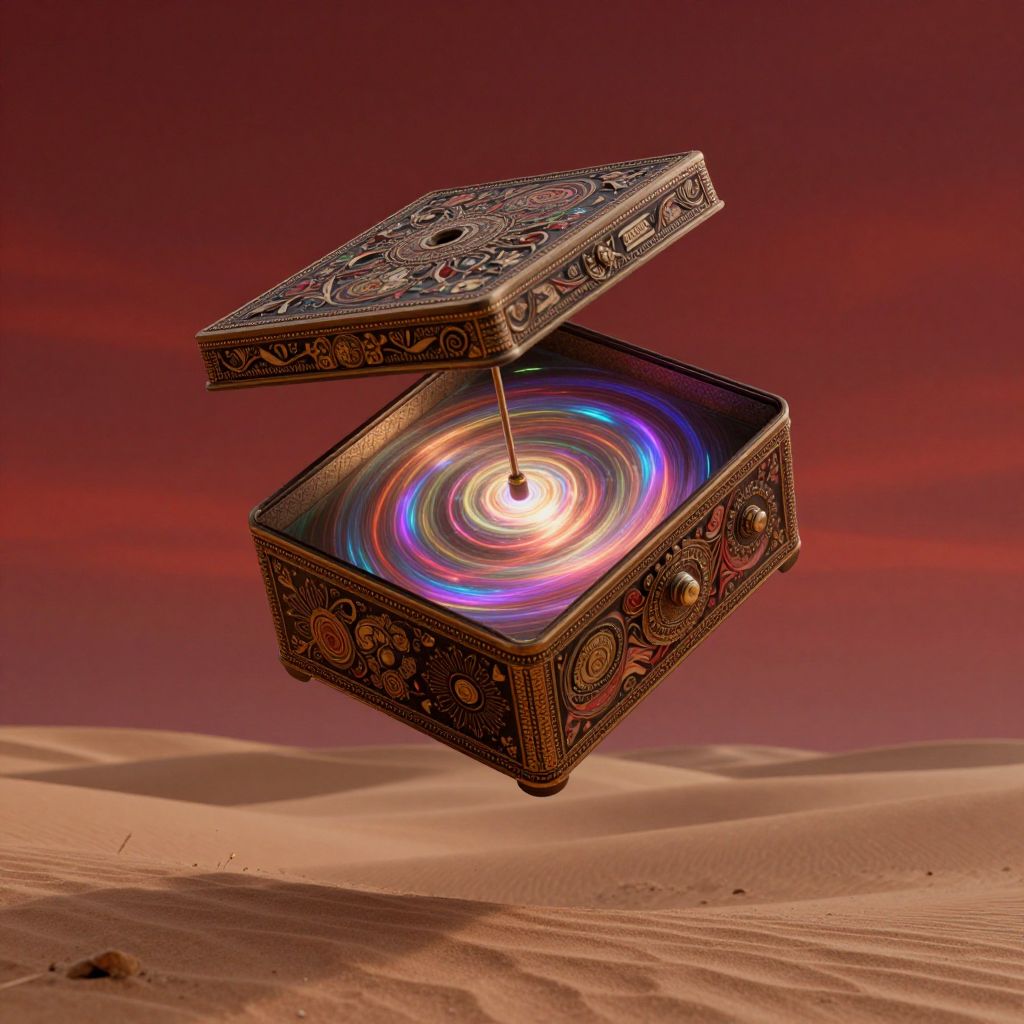 Craft an enigmatic digital artwork depicting a dreamlike setting where an antique music box drifts elegantly above a desolate desert landscape beneath a crimson sky. The music box showcases intricate engravings inspired by ancient mythologies and as it rotates, emits a mesmerizing whirlpool of vivid, shimmering hues that envelop the sand dunes, stirring both awe and melancholy. This captivating scene harmoniously blends elements of fantasy and timelessness, sparking contemplation on the cryptic bond between this ethereal artifact and its barren surroundings while enveloping viewers in an atmospheric realm brimming with enigmatic allure.