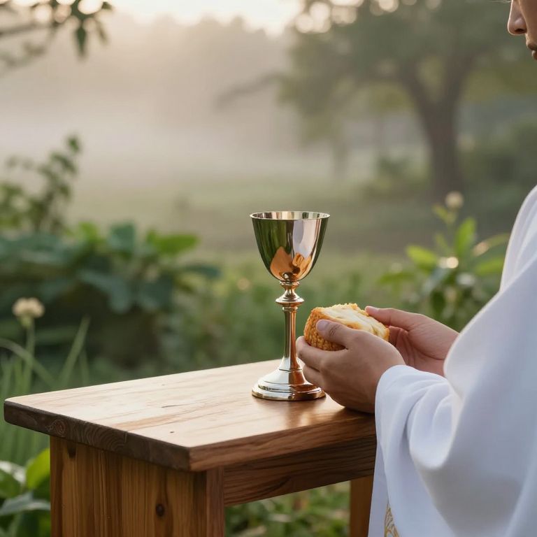 Eucharist celebration in an outdoor setting at sunrise, wooden altar surrounded by nature, gentle fog lifting over lush greenery, close-up of hands holding chalice and bread, warm and peaceful mood, hyper-detailed with subtle natural lighting.