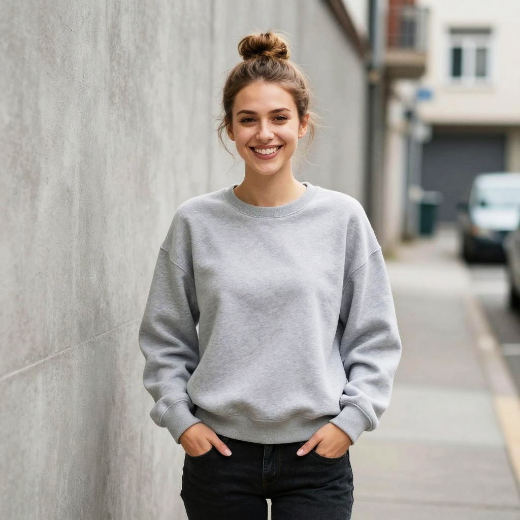 Photograph of a young woman standing on a city sidewalk beside a concrete wall. She has light skin, brown hair in a messy bun, and is smiling. She wears a light gray, oversized sweatshirt with black pants and her hands are in her pockets. The background shows an urban street with blurred buildings, a parked car, and a trash can. The image has a natural, candid style with soft lighting and a slight depth of field that blurs the background.