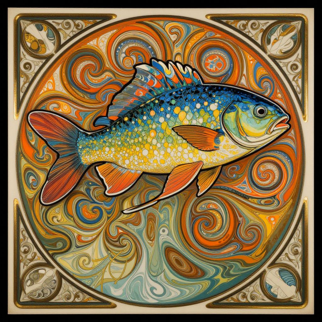 This is a vibrant, digital illustration of a colorful fish with a gradient of blue, yellow, and orange scales, featuring orange fins and a white underbelly. The fish is centrally positioned within a circular, swirling pattern of orange, yellow, and blue hues, creating an abstract, marbled effect. The image is framed by a thick black border with ornate, floral-like corners in beige and gold. The fish's scales are detailed with small, bright yellow spots, and its expression is lively with a slightly open mouth. The background swirls are dynamic and fluid, adding a sense of movement to the piece.