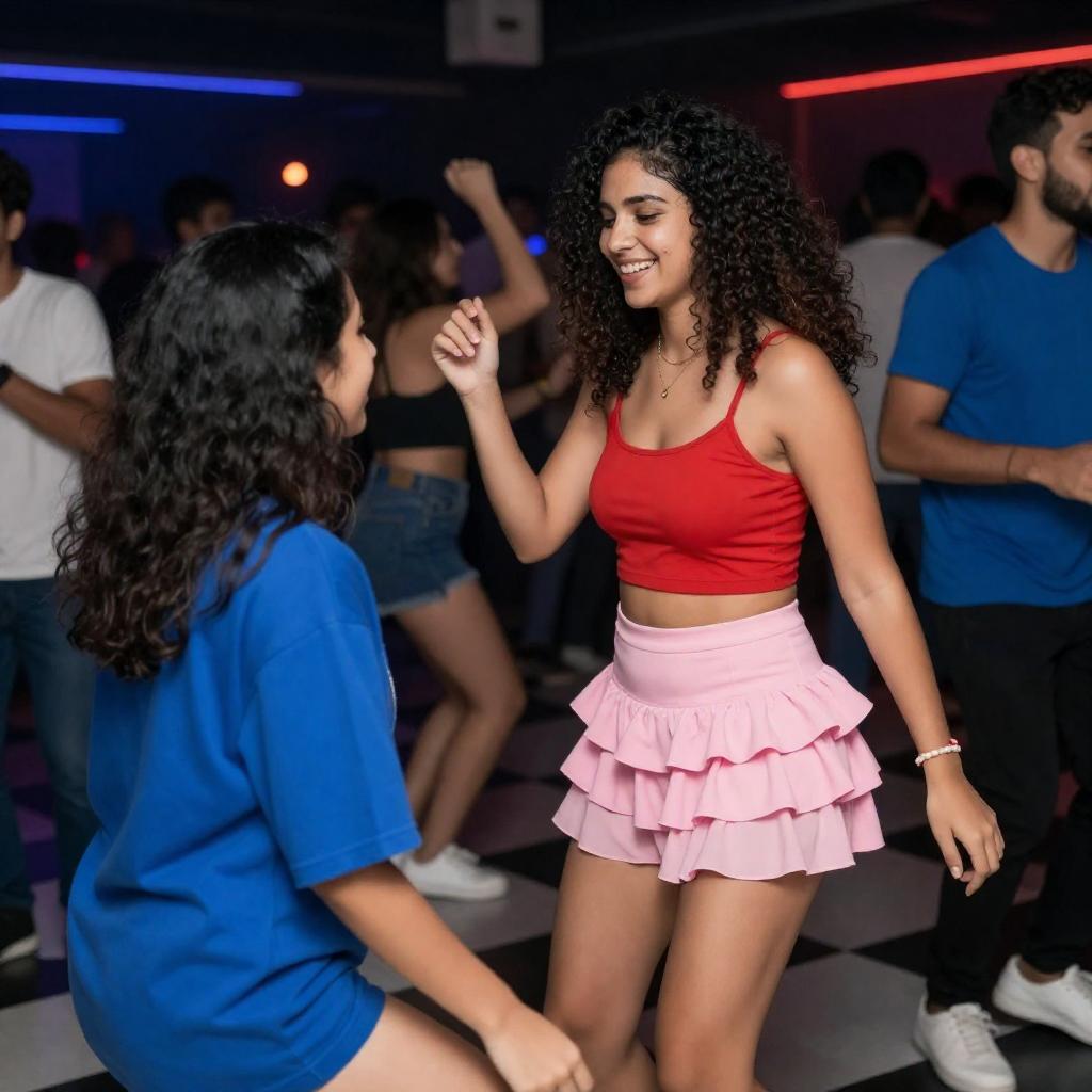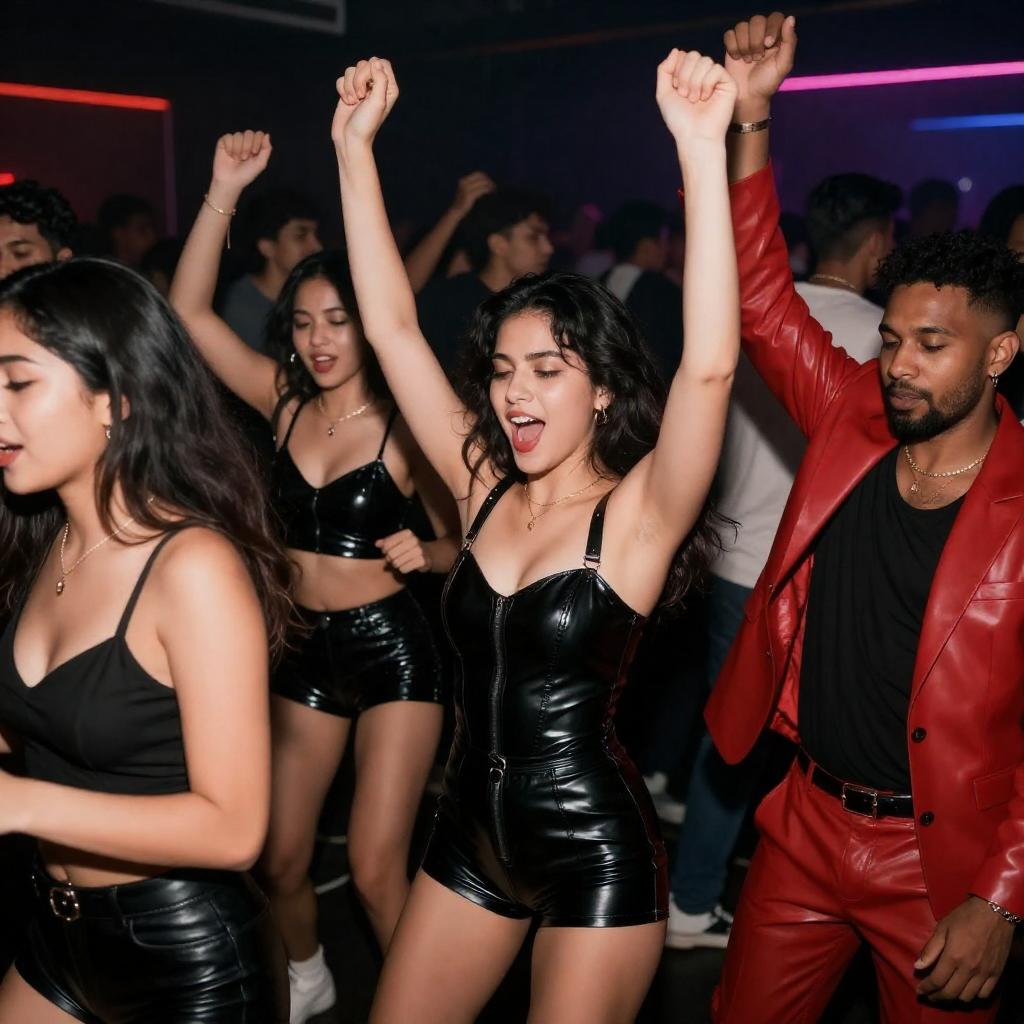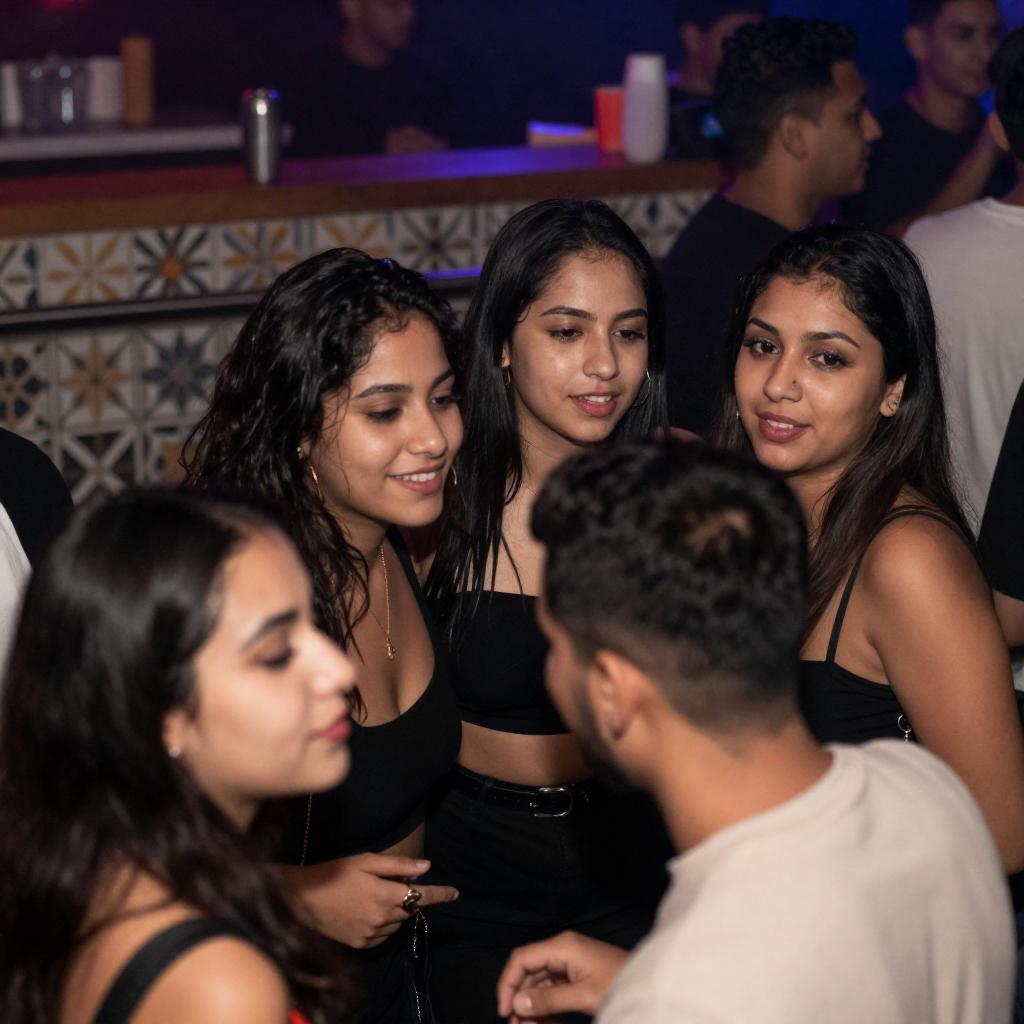 Photograph of four women in colorful jester costumes with pink and white hats, white ruffled collars, and pink thong underwear, dancing and smiling at a vibrant, crowded party. Bright neon lights and a tented background create a festive atmosphere. The women have tan skin and are posing playfully, with one kneeling in the front.