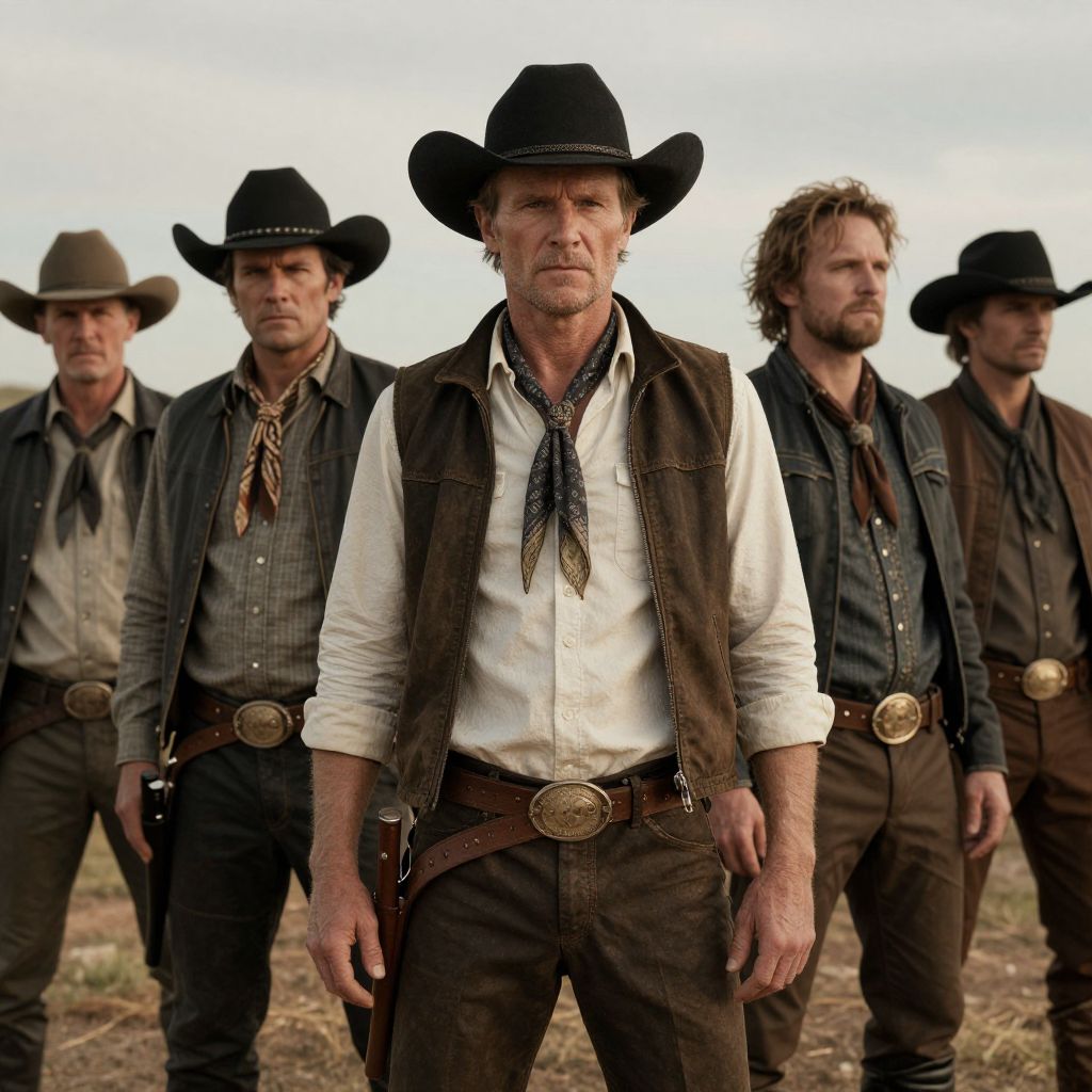 Photorealism of in the style of the video blade runner, western setting, billy the kid and the gang posing, photorealistic, hyper realistic, realistic, cinematic, dramatic, trending
