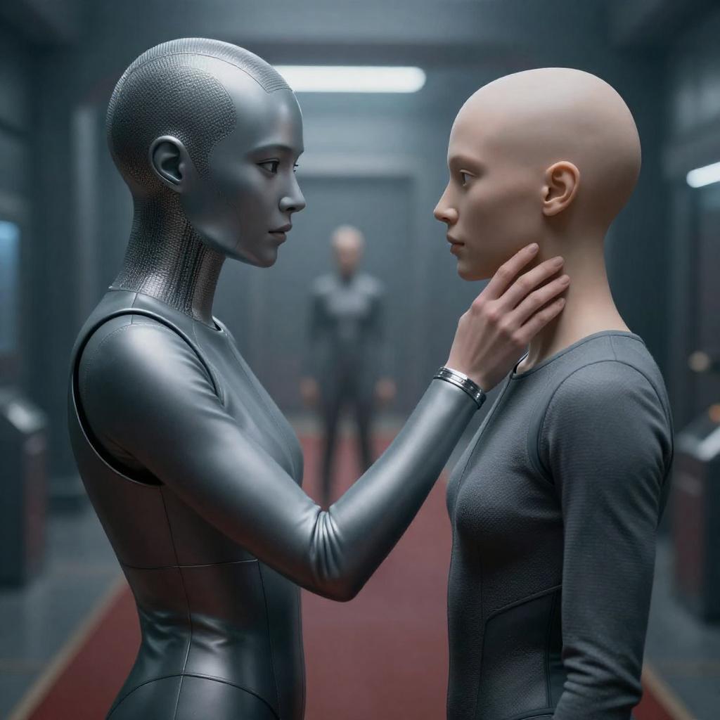 CGI image of a futuristic scene: a woman with a metallic, mesh-like head and gray bodysuit gently touches a disembodied, bald head. The background features a dimly lit, sterile hallway with a red carpet and another figure in the distance.