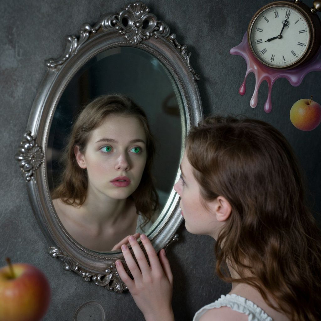 A surrealistic portrait depicting a young woman with captivating green eyes, gazing into an enigmatic, shimmering mirror. From an aerial viewpoint, her reflection divides into two distinct forms - one serene and the other tormented, embodying the duality of human emotions. The surrounding environment dissolves into an abstract dreamscape, filled with melting timepieces and floating fruit, creating a sense of unease as it delves into the mysterious realms that reside within our subconscious. This haunting scene masterfully explores themes of perception, depth, and the complex nature of our inner selves through a captivating blend of surrealism and symbolism.