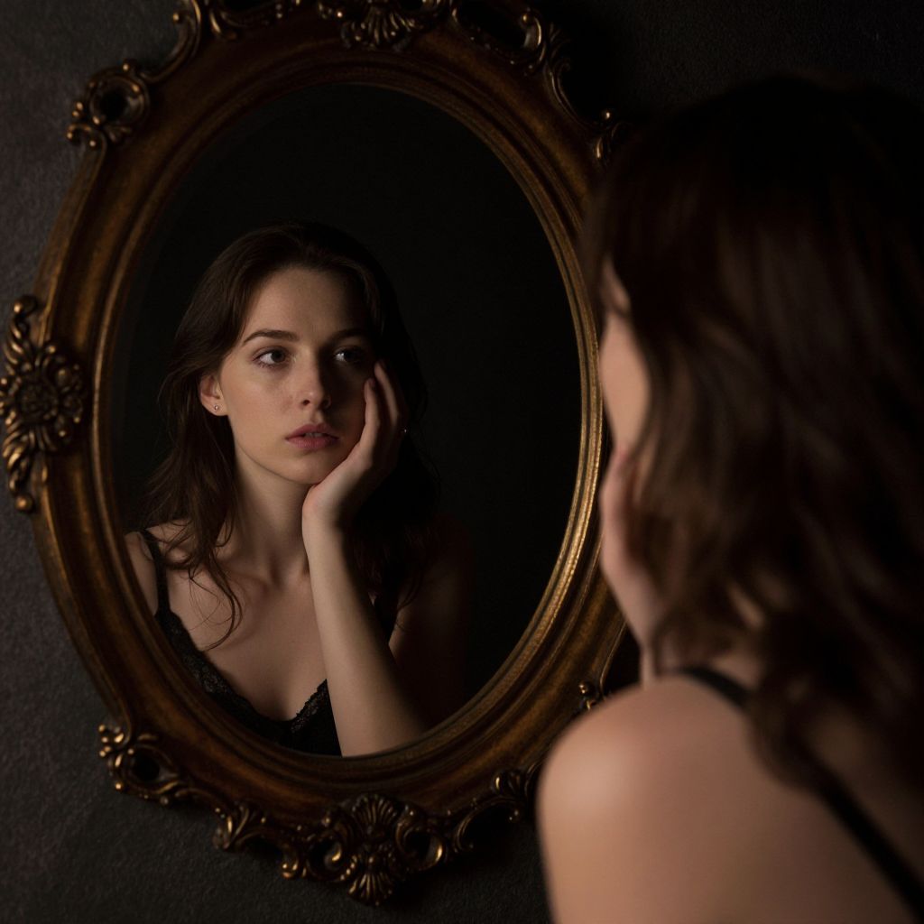 Photograph of a fair-skinned woman with green eyes, brown hair, and red lips, gazing into an ornate, oval mirror, with