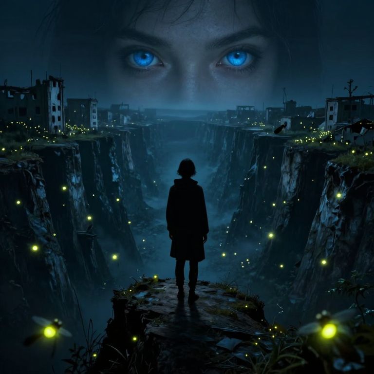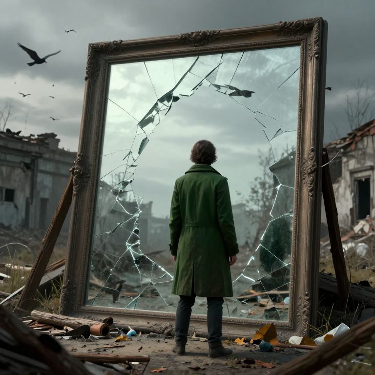 In this highly detailed and ultra-realistic digital art piece, a solitary figure in a green coat stands in front of a large, broken mirror that reveals a desolate, post-apocalyptic landscape. The mirror, with its ornate frame and shattered glass, serves as a portal to a world of ruins and decay. The figure's back is turned to the viewer, adding an air of mystery and contemplation. The background features a dilapidated building, a flock of birds in flight, and a hazy, overcast sky, all bathed in volumetric lighting that casts soft shadows and highlights the textures of the scene. The ground is strewn with debris, including logs, sand, and garbage, contributing to the sense of abandonment and desolation. The overall composition is dynamic, with the mirror acting as a focal point that draws the viewer's eye into the scene, creating a sense of depth and immersion. The use of low contrast and sharpness enhances the realism, making every detail—from the cracks in the mirror to the individual leaves on the ground—stand out vividly. The scene is a blend of natural and man-made elements, with textures ranging from the smooth glass of the mirror to the rough, weathered wood of the building. The interplay of colors, shapes, and textures creates a rich, immersive experience that invites the viewer to explore the narrative of this post-apocalyptic world.