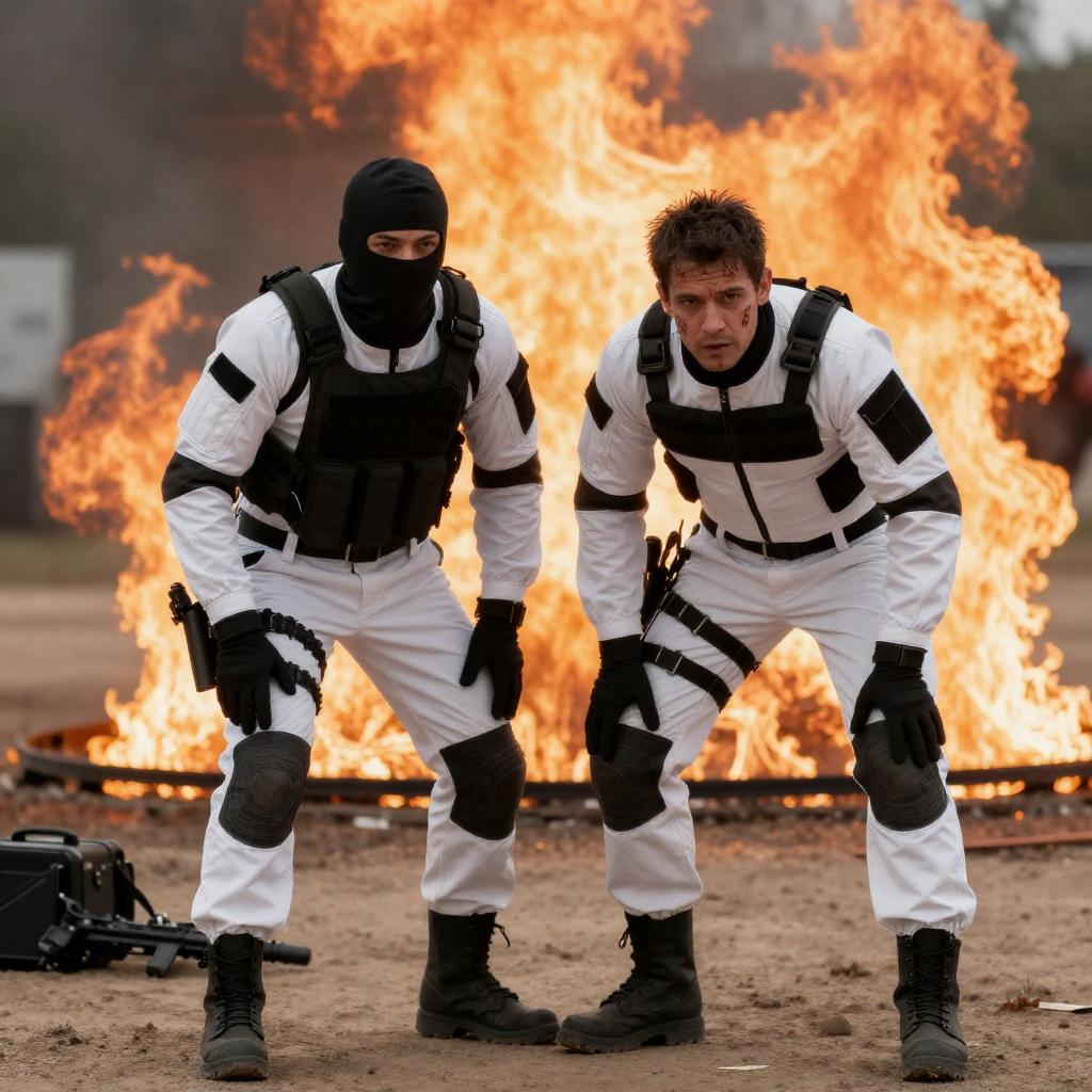 Photograph of a dramatic scene: a man in a white and black tactical outfit, with short dark hair and a distressed expression, leans forward beside a person in a black balaclava and tactical gear. They are on a dirt ground with scattered equipment, surrounded by intense, bright orange flames in the background.