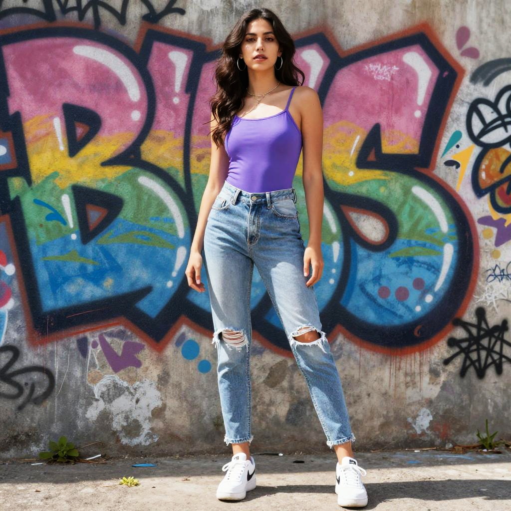 Ana de armas full body, vibrant street style fashion, colorful graffiti background, casual trendy outfit, natural pose, bright daylight, ultra-realistic shading