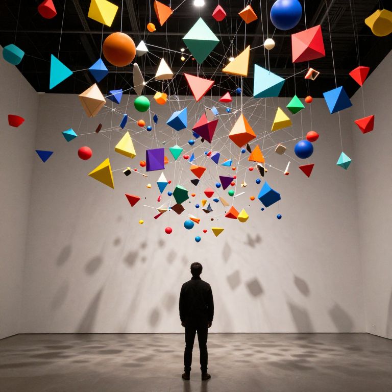 Photograph of a modern art installation in a white-walled gallery. A silhouette of a person stands at the center, facing upward. Above, a vibrant array of colorful, floating geometric shapes and spheres, including triangles, circles, and cubes, dangle from the ceiling. The shapes are illuminated, casting colorful shadows on the walls. The floor is dark, contrasting with the bright, multicolored overhead display. The person's attire is indistinguishable due to the shadow. The overall composition is dynamic and engaging, with the bright, colorful shapes creating a striking contrast against the plain gallery walls.