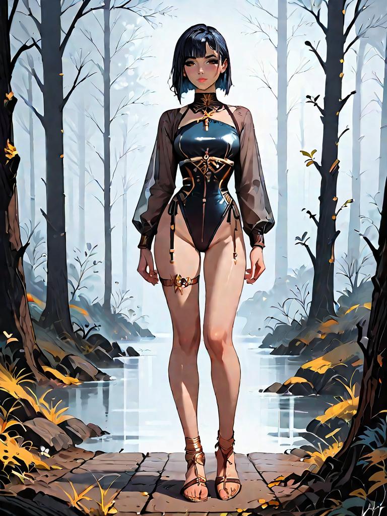 Full-body digital artwork of a young woman standing confidently on a stone bridge in a foggy medieval dark forest. She wears a bold, dark plunge neck swimsuit with gold accents and metallic rings paired with a sheer lightweight mesh cover-up with long sleeves. Her look is completed with tan leather strappy flat sandals and a gold thigh garter. The background features mist, tall bare trees, and subtle torchlight reflections in a tranquil water setting, conveying an ominous night atmosphere.