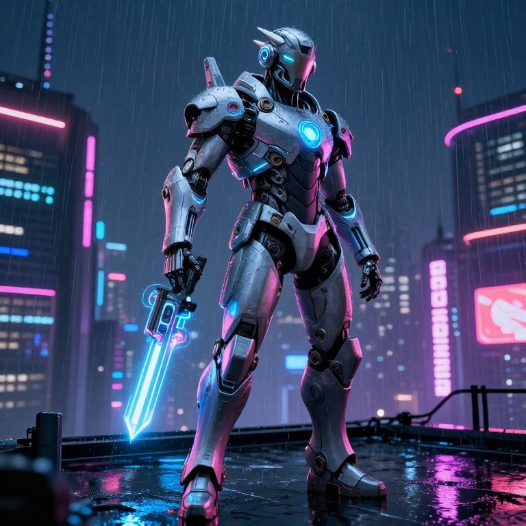 Neon-Lit Armored Hero in Rain