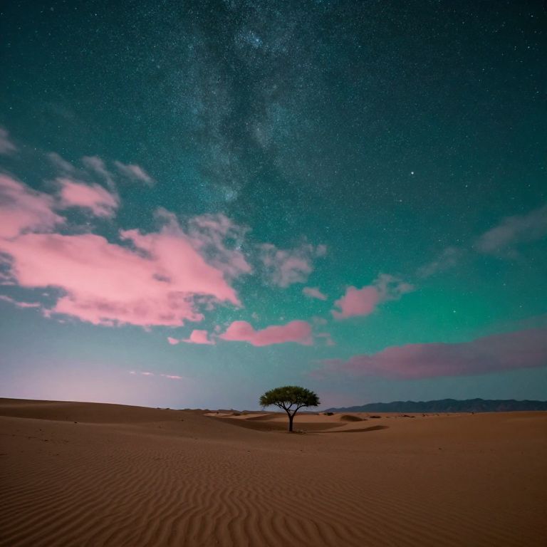 A vivid, starry night sky over a stark, empty desert landscape with pink and green clouds, a single tree, and distant mountains.