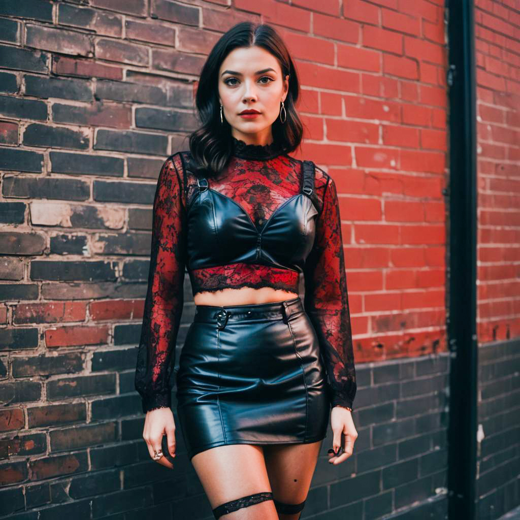 Portrait of a young woman with broad shoulders wearing a sheer red lace bralette and a high waist black leather mini skirt, standing against a brick wall. The woman has side-swept dark hair, wearing a black choker necklace and sheer thigh-high stockings. The photo has an urban, lomography style aesthetic.