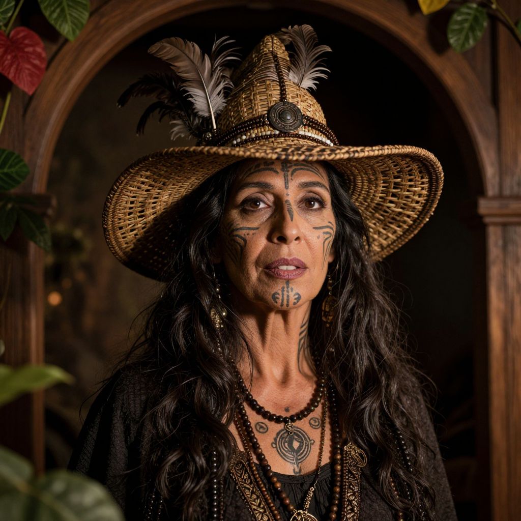 Envision a portrait photograph embodying an enigmatic Victorian-era witch doctor's profound wisdom and mysterious aura. The subject, a middle-aged Mediterranean woman with rich, dark skin and intricate tribal facial tattoos, exudes intensity through her pensive gaze from beneath the wide brim of her woven hat adorned with feathers and beads. Soft ambient light casts dramatic shadows across her face, highlighting full lips slightly parted as if whispering ancient secrets. Framed within a wooden archway amidst vibrant foliage, this ethereal yet tangible portrait evokes intrigue and respect for age-old traditions.