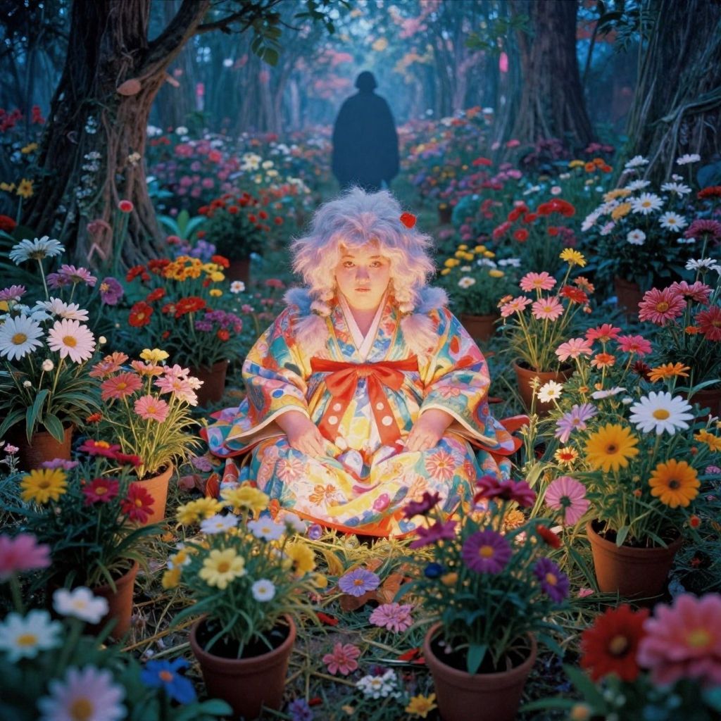 Photograph of a whimsical forest scene featuring a young person with curly white hair, wearing a colorful, floral kimono with a red bow. They are sitting in a sea of vibrant potted flowers including daisies, marigolds, and sunflowers. The person's hands are gently resting on their lap, illuminated by a soft, warm light. In the background, a dark silhouette of a person stands among tall trees, creating a mystical atmosphere. The forest floor is carpeted with various flowers, and the scene is bathed in a magical, blue twilight light.