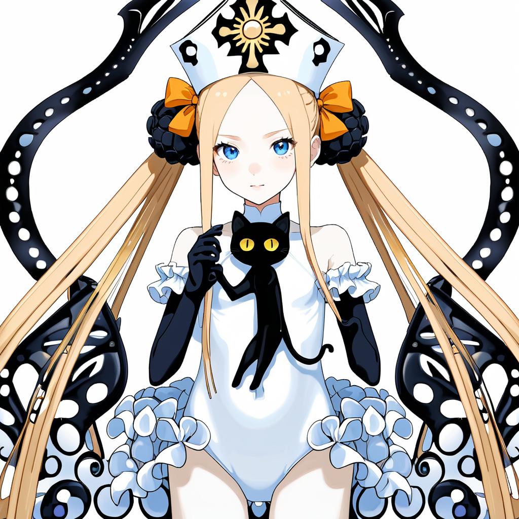 Abigail williams (swimsuit foreigner) (second ascension) (fate), fate/grand order, 1girl, blue eyes, blonde hair, very long hair, parted bangs, sidelocks, double bun, twintails, braided bun, small breasts, thighs, covered navel, white one-piece swimsuit, dress swimsuit, white headwear, bare shoulders, orange bow, black bow, multiple bows, forehead, black cat, keyhole, mitre, white hat, by artist tina fate, anime
