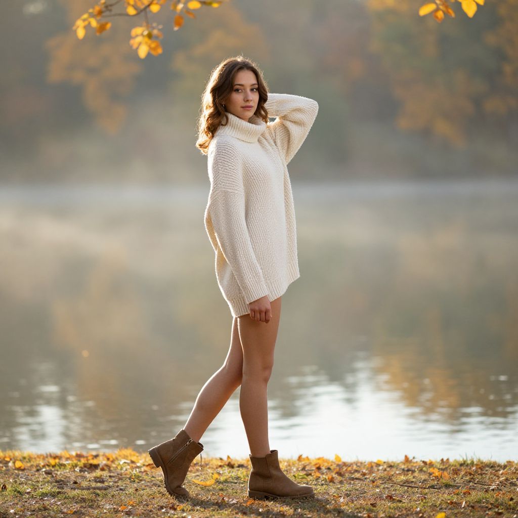 Photograph of a young woman with wavy dark brown hair standing by a calm lake during autumn. She wears a cozy, oversized white knit sweater dress and brown ankle boots. Her right hand is raised, touching her head, while her left arm hangs by her side. The background features a misty lake with reflections of orange and yellow autumn leaves, and a grassy bank with scattered leaves. The lighting is soft, with sunlight filtering through the trees, creating a serene and warm atmosphere.