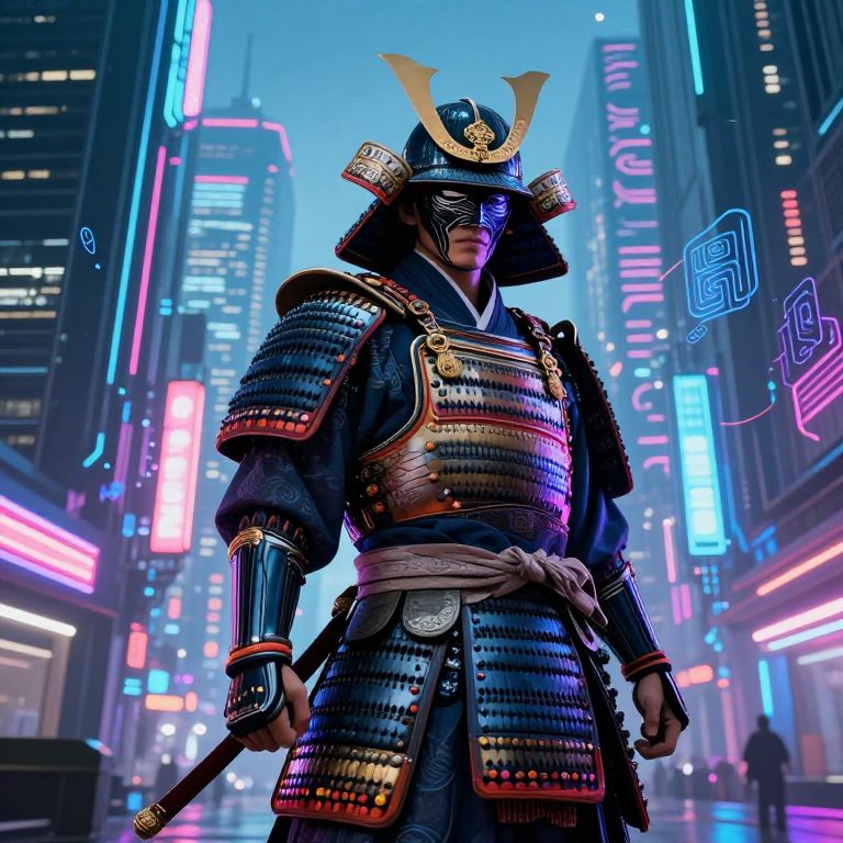 Amidst a bustling cyber cityscape, an enigmatic figure clad in ornate samurai armor stands tall. Their face, hidden behind a helmet with etched visors, hints at emotions of determination and conflict. Vibrant neon lights from towering skyscrapers illuminate intricate circuits and holographic patterns intertwined with traditional armor motifs. As the samurai moves through this futuristic landscape, their shadow seamlessly merges with abstract reflections on glass facades, creating a captivating double exposure effect that symbolizes the fusion of past and future, technology and tradition.