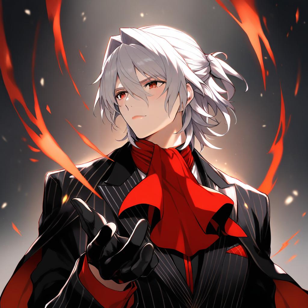 Antonio salieri (second ascension) (fate), fate/grand order, 1boy, red eyes, hair between eyes, grey hair, white hair, short hair, pinstripe suit, suit, black gloves, pinstripe suit, suit, black jacket, long sleeves, formal, half updo, formal, red ascot, by artist berusuke (beru no su), animagine