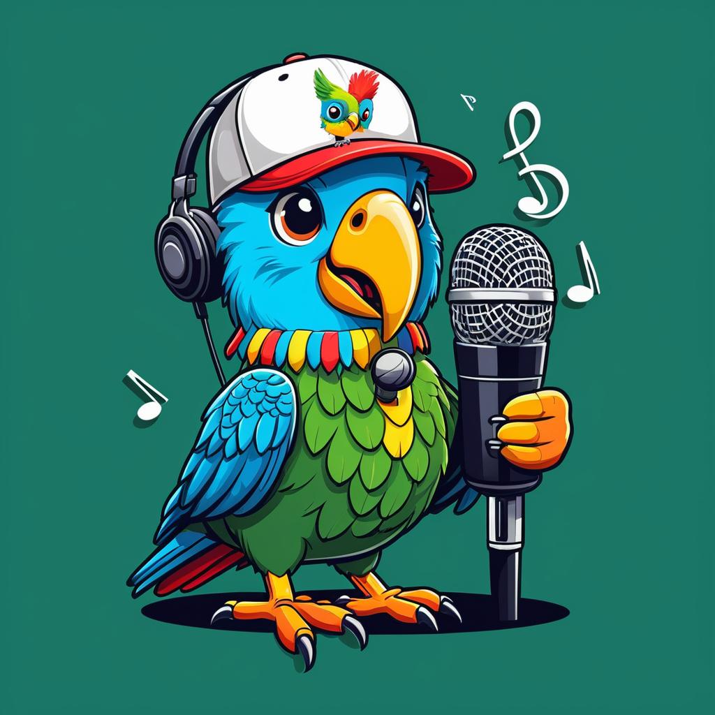 Logo of a cute cartoon parrot with a feathered cap holding a microphone, playful with a music note icon, bold colors, for a brand named Parrot Performers.