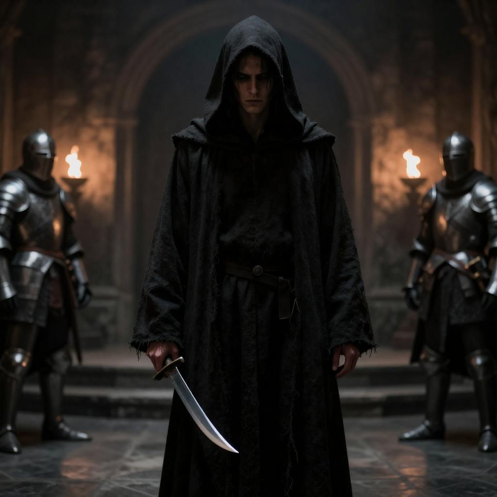 Photograph of a dark, grim scene. A hooded figure in a long, tattered robe stands with a curved dagger in a dimly lit, stone-walled room. Several armored figures in the background. Flickering firelight casts shadows. Intense, focused expression.