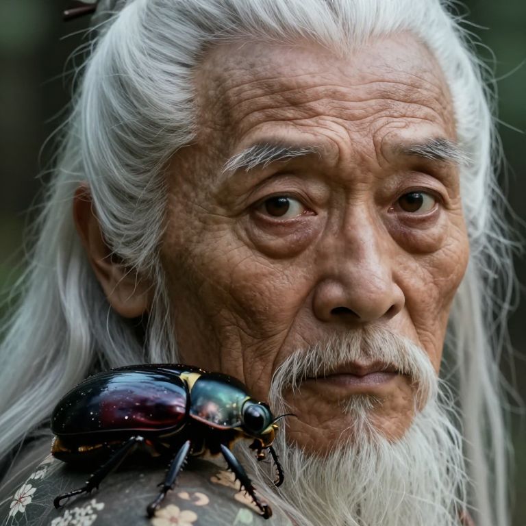 A photorealistic portrait captures the essence of an ancient sage, viewed from a unique 'bug's-eye' perspective, as if seen through the pupil of a colossal beetle resting on their shoulder. The sage's face is a map of weathered skin and intricate wrinkles, while their deep, soulful eyes seem to hold centuries of knowledge. Flowing white hair frames the face, adorned with delicate floral patterns reminiscent of Japanese ukiyo-e woodblock prints. Soft, diffused lighting casts dramatic shadows across their features, highlighting the emotional depth within their gaze. This intimate, unconventional close-up evokes a sense of wonder and reverence for nature and ancient wisdom, creating an unforgettable visual experience that blends traditional and modern artistic sensibilities.