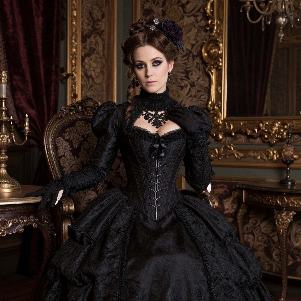 Victorian beautiful gothic woman in a richly decorated Victorian parlor, adorned with dark brocade fabrics and antique furniture, wearing a dramatic black gown with a high neckline and corset, her look completed with smoky eyes and a dark rose hair accessory.