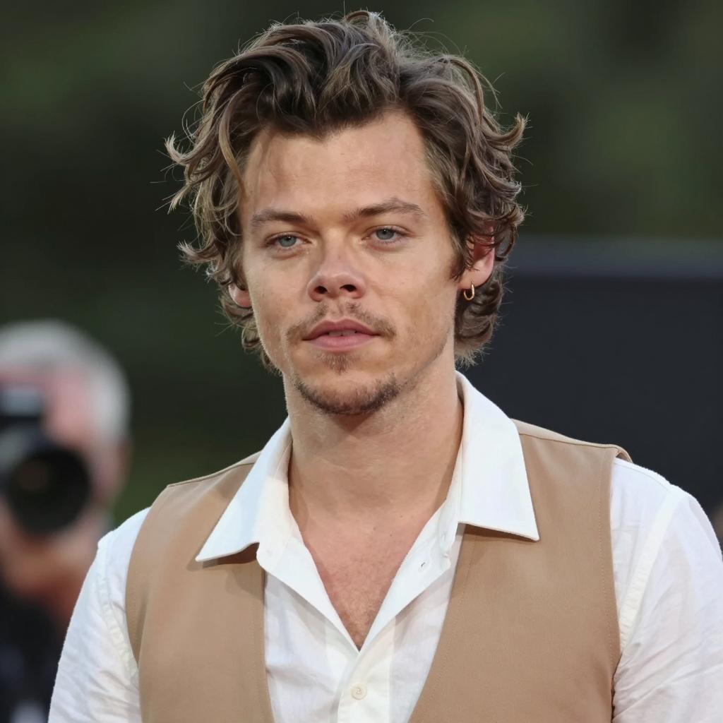 Harry styles concert costume, photorealistic portrait of a young man with wavy brown hair, blue eyes, fair skin, wearing a white shirt and tan vest, gold earring, serious expression, outdoor background, shallow depth of field, natural light, soft shadows, slight bokeh effect, casual vintage style, front-facing, upper body, focus on face, realistic ure, slight warm color tone