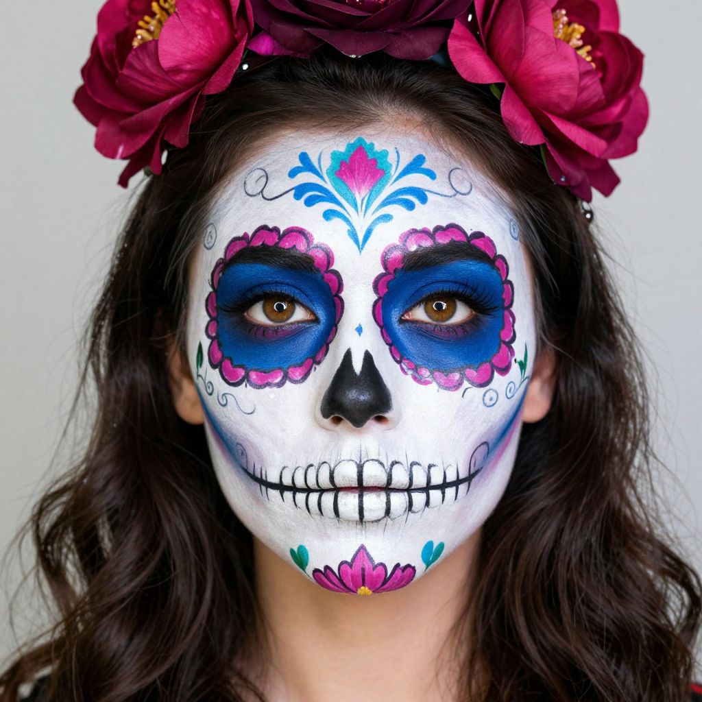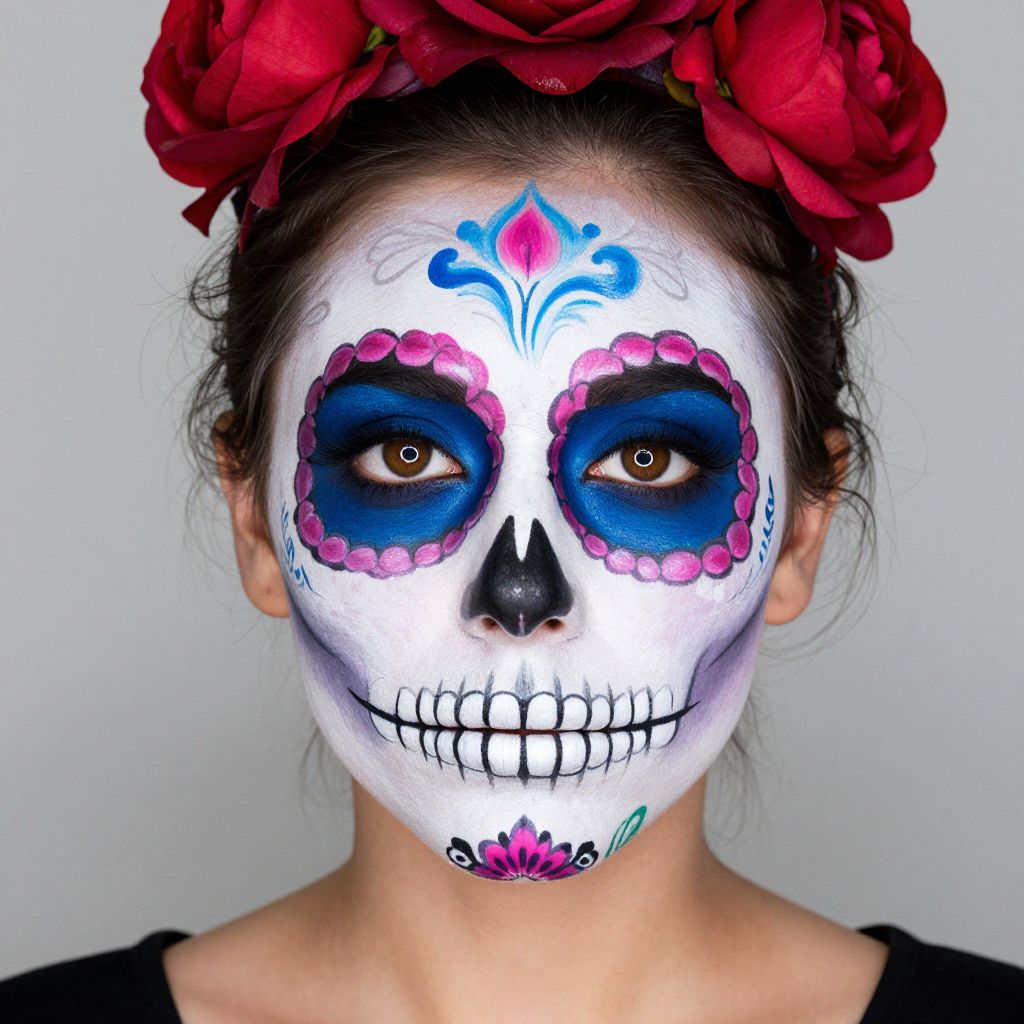 Photograph of a woman with a white face painted in the style of a sugar skull, featuring vibrant blue and pink circular eye sockets, black nose, and teeth. Her eyebrows are blue, with a pink and blue floral design above her forehead. She has dark brown eyes and wears a red floral crown. The background is plain white, and she is dressed in a black top. The makeup and crown add a festive, Day of the Dead (Día de los Muertos) aesthetic to the image.